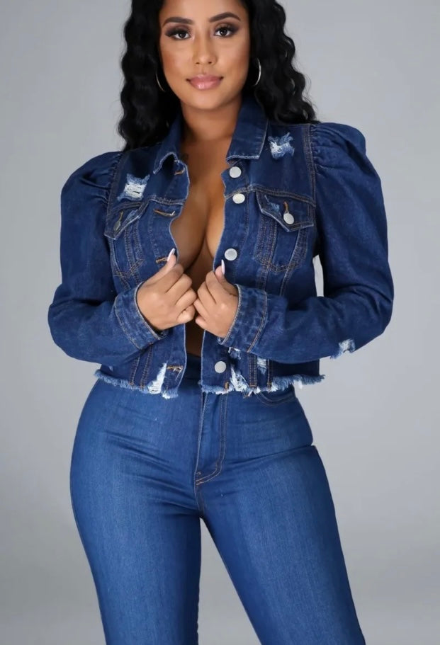 Cropped distressed stretch denim top puff sleeves