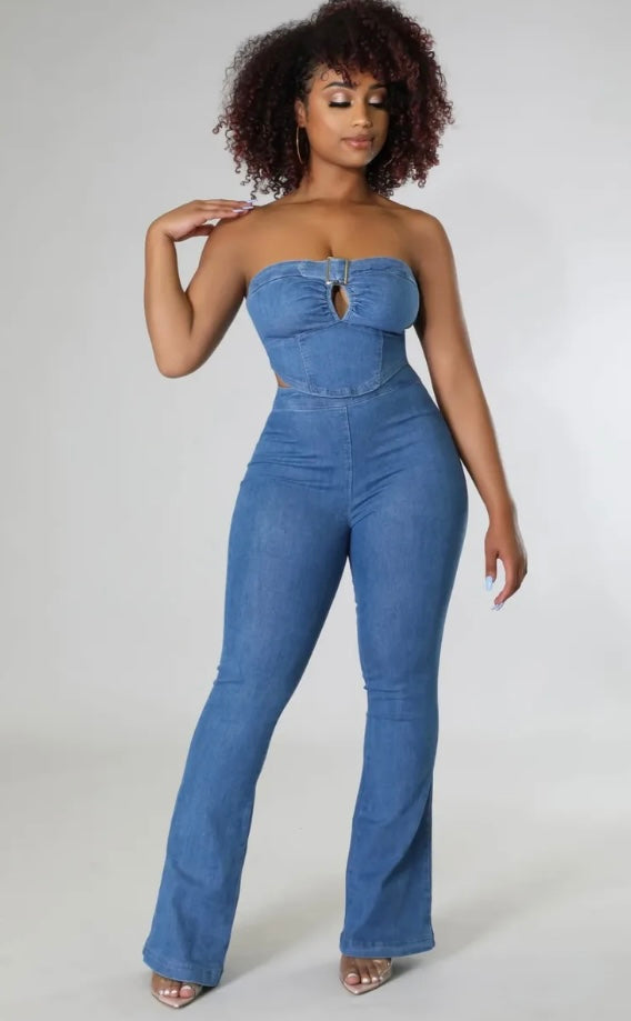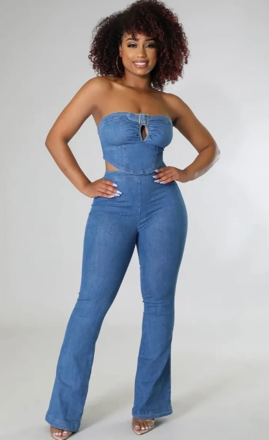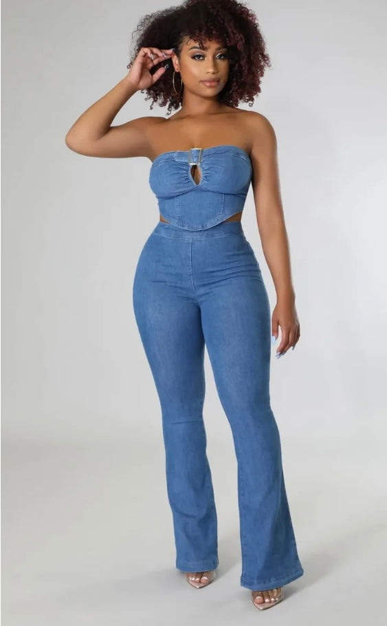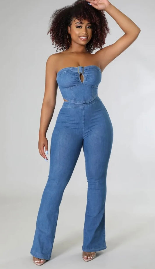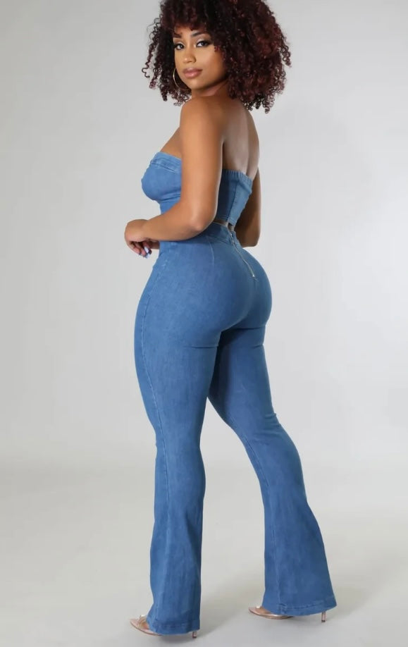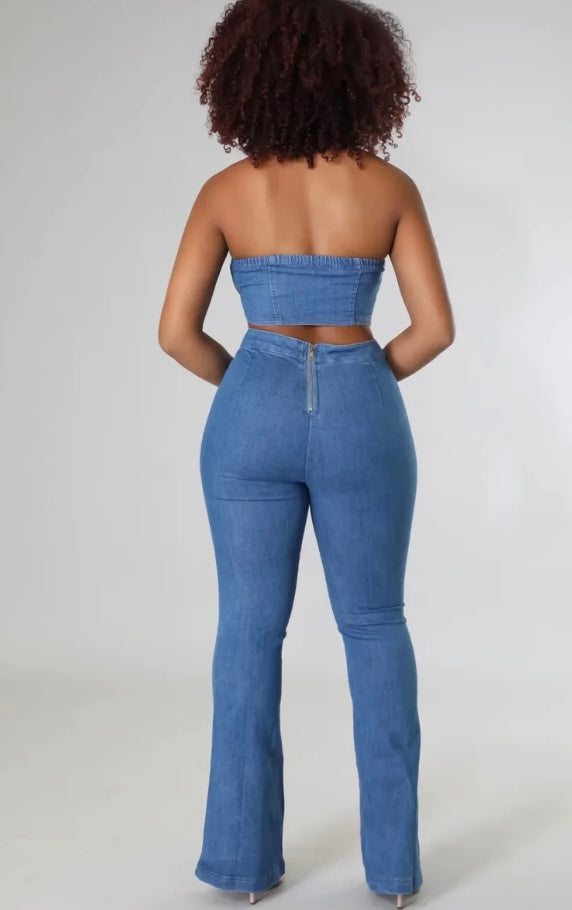 Two-piece set crop top strapless side zipper closure flare legs high waisted pants
