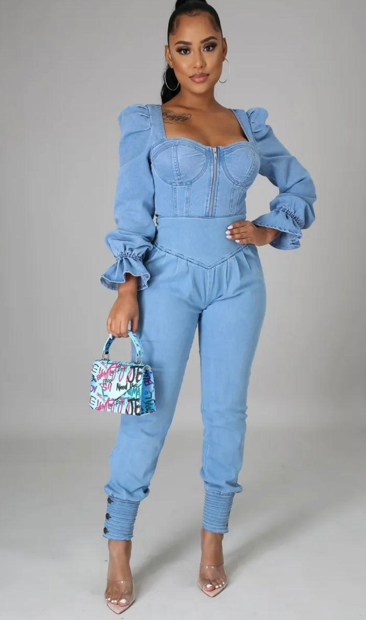 Stretch Denim Pants Pockets buttons on ankle Zipper closure Model is wearing a Small
