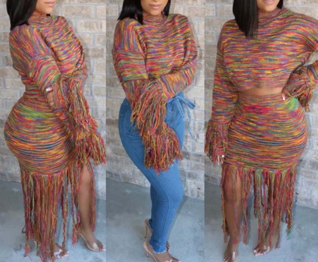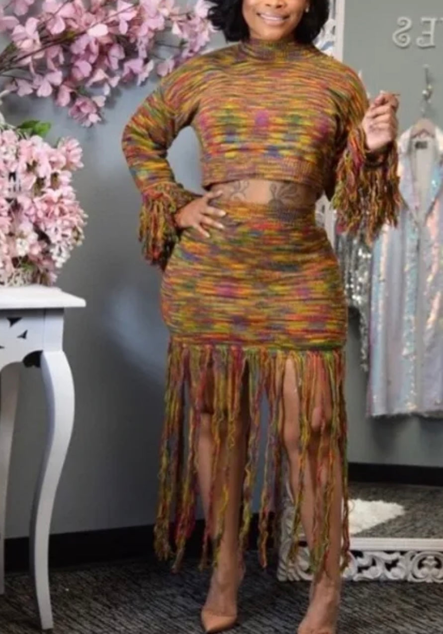Premium Sweater Fringe Set multi color fringed sweater top and skirt set is a Must Have….