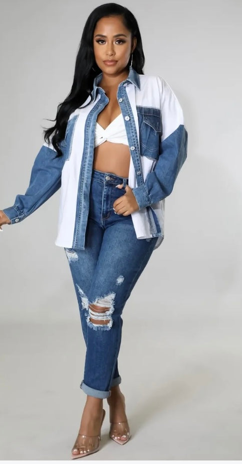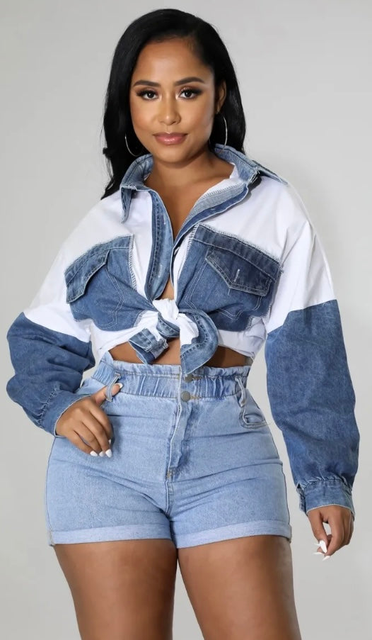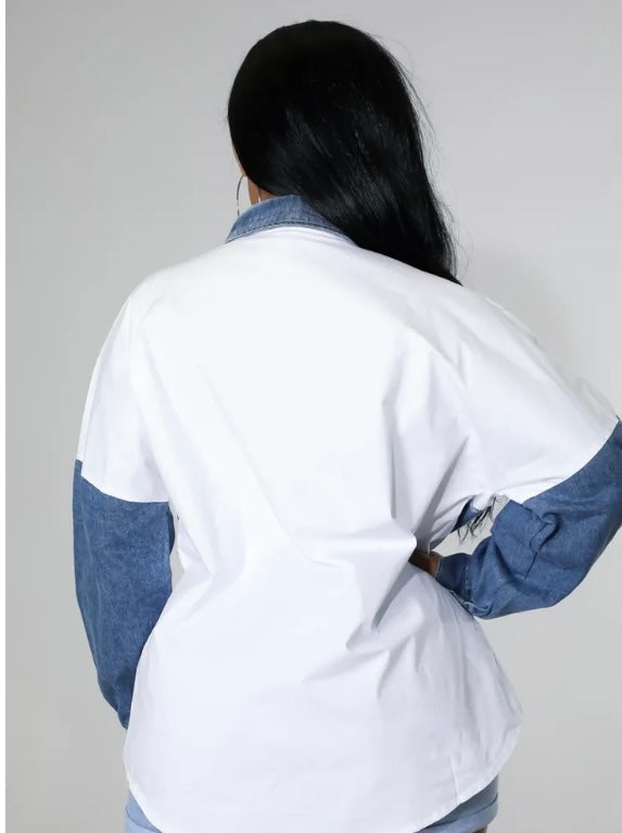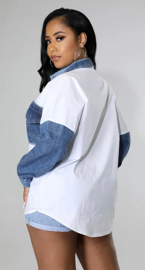 Turnic collar long sleeve top denim detail faux pocket button closure