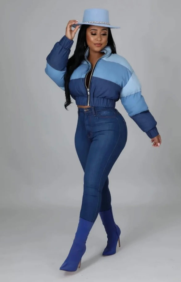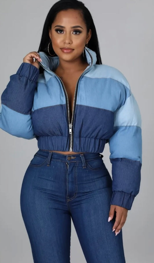 Crop puff denim jacket Round neckline Long sleeves Zipper closure