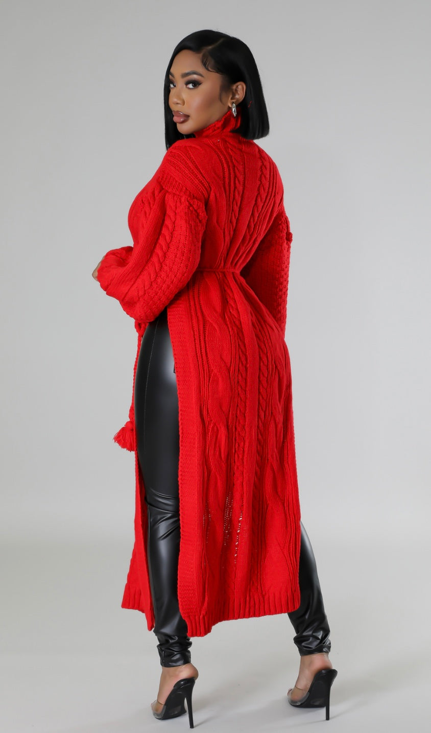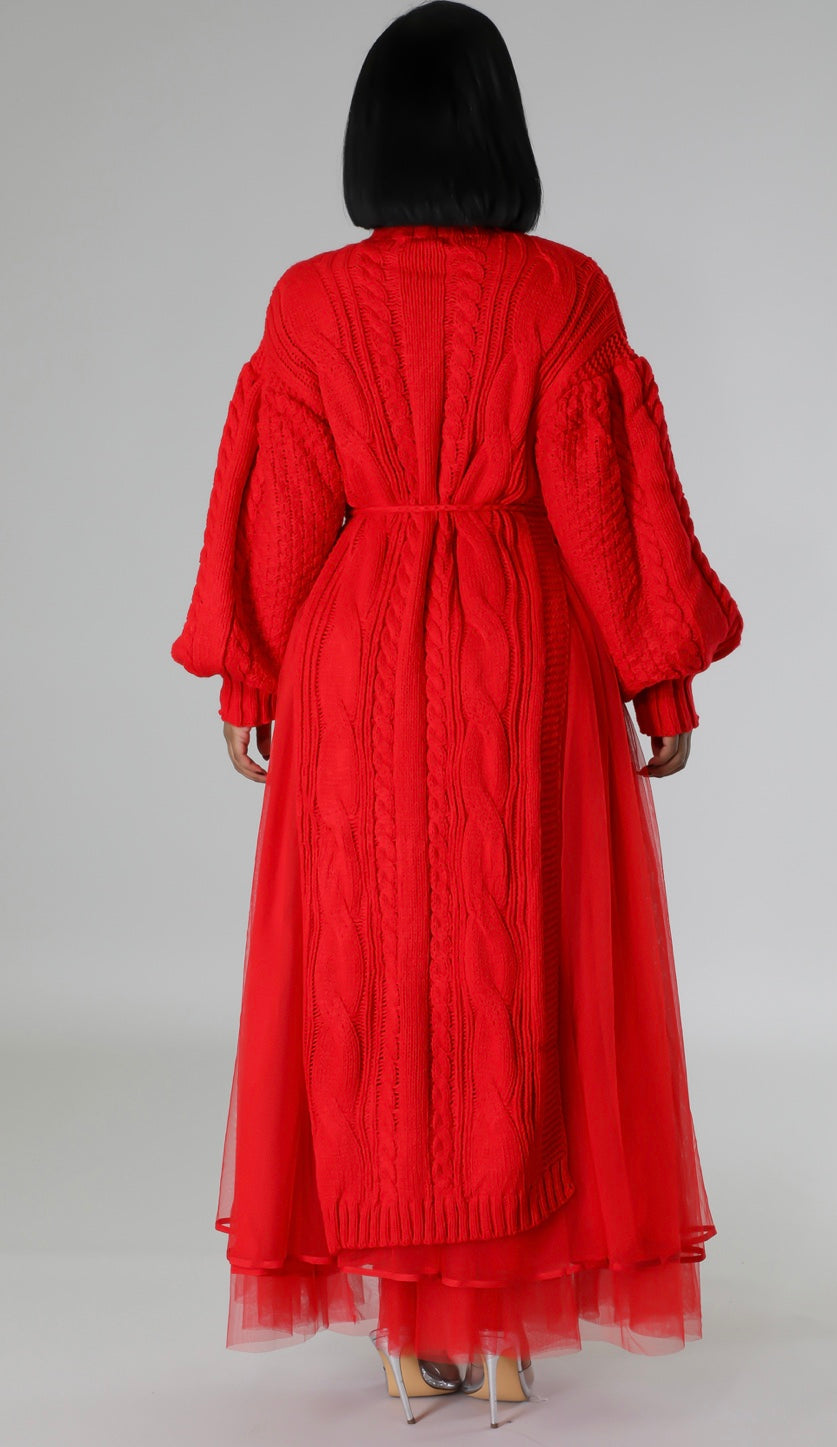 Two piece set Long knit cardigan Mock neck Long sleeved Open sides Self tie waist High waisted skirt Elastic waistband Tulle